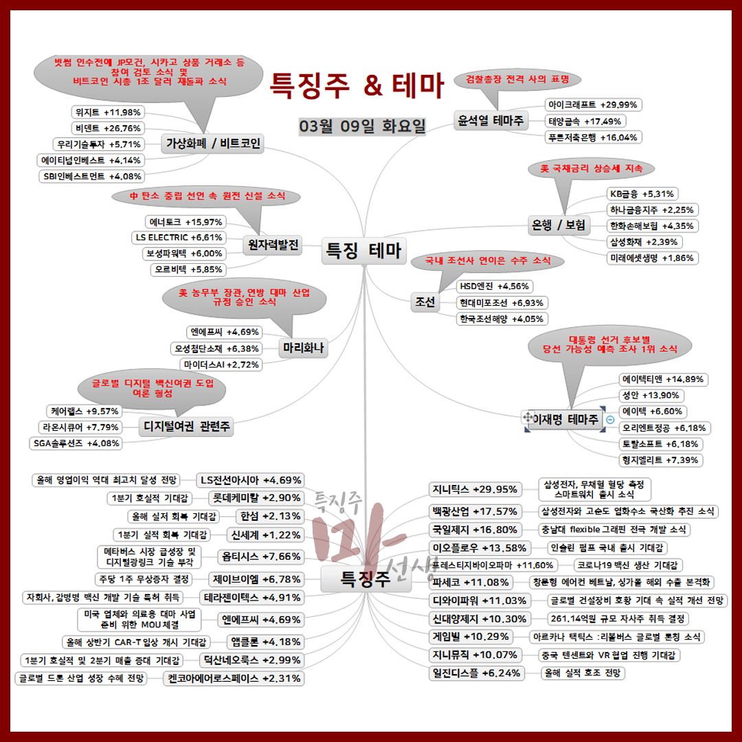 3월 9일 금일 특징주 및 특징테마 잘 확인해보시길 바랍니다.