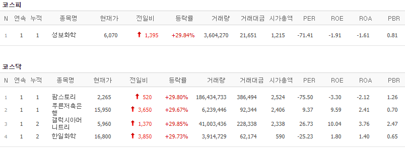 코스피에서는 성보화학이 상한가를 기록했고, 코스닥에서는 팜스토리, 푸른저축은행, 갤럭시아머니트리, 한일화학이 상한가를 기록했습니다. 반면 센트럴인사이트가 하한가를 기록했습니다.