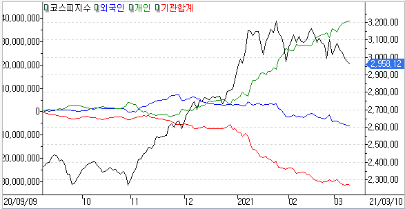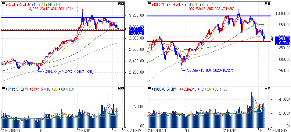 금일 코스피 지수는 -0.60% 하락한 2,958.12에 마감하였고, 코스닥 지수는 -0.70% 하락한 890.07에 마감하였습니다. 지난 뉴욕증시는 반등을 보였으나 여전히 美 국채금리의 방향이나 미국의 국채 입찰 등의 관망세와 중국발 인플레이션 우려까지 나오면서 부진한 증시 흐름을 보여주었습니다.
