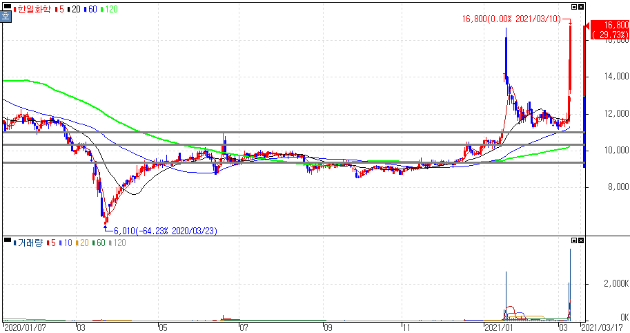 정치 테마주 성향으로 상한가를 기록한 한일화학 주가 입니다. 윤석열 관련주냐, 오세훈 관련주냐 보는 시각에 따라 다르기도 합니다.