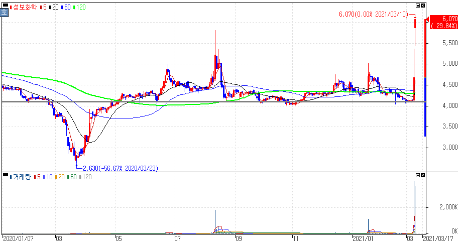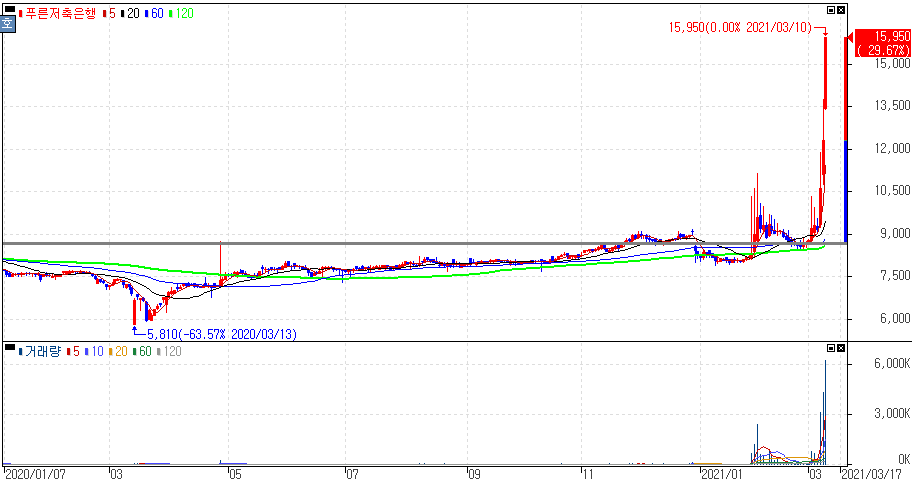 차기 대선후보 지지도에서 윤석열 전 검찰총장이 선두를 기록한 여론조사 결과가 나오면서 일부 윤석열 관련주 종목 상승을 보이면서 상한가를 기록한 성보화학, 푸른저축은행 주가 입니다.