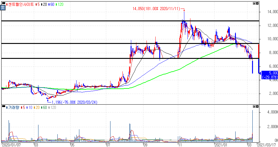 불성실공시법인 지정예고에 하한가를 기록한 센트럴인사이트 주가 입니다. 타법인주식 및 출자증권 취득결정 공시(21.02.04) 내용 중 출자금액의 50% 이상의변경공시(21.03.09)로 불성실공시법인 지정예고 공시가 나왔습니다.