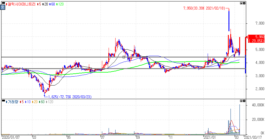 종목으로 보는 갤럭시아머니트리로는 지난 쿠팡 관련주 및 비트코인 결제 가능 소식에 단기적 가파른 상승을 보였으나 단기적 급락을 보인 이후 재반등한 모습입니다.