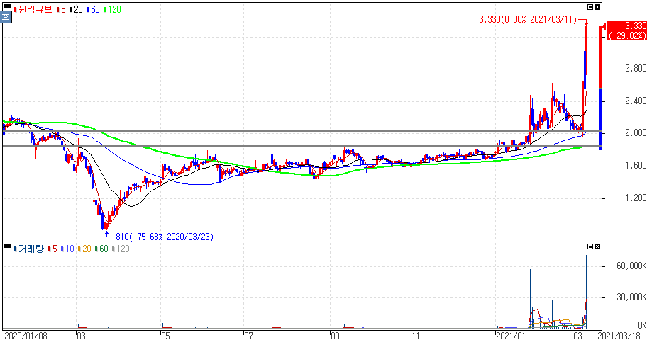 차기 대선 주자 선호도 조사 지지율 1위 윤석열 전 검찰총장 모멘텀 지속에 상한가를 기록한 원익큐브 주가 입니다.