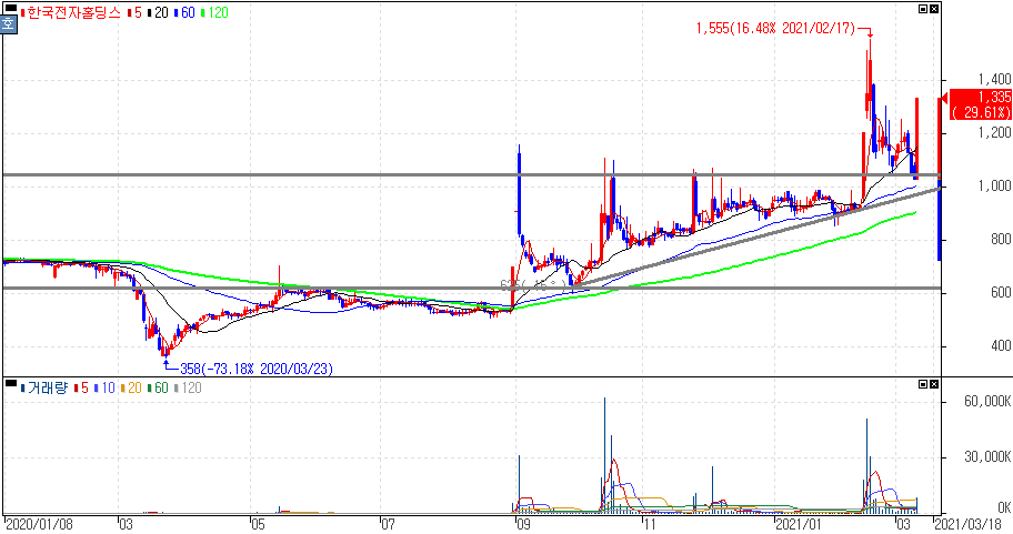 쿠팡 뉴욕증시 상장 앞두고 대규모 물류센터 물류부지 확보 소식에 수혜주로 상한가를 기록한 한국전자홀딩스 주가 입니다.