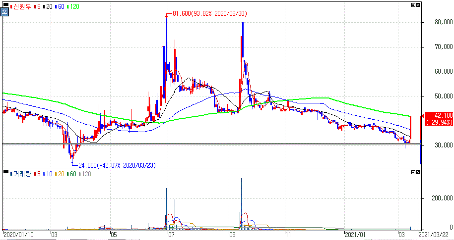 구체적인 재료 미노출 속 최근 보통주 자사주 매입을 보이며 상한가를 기록한 신원우 주가 입니다.