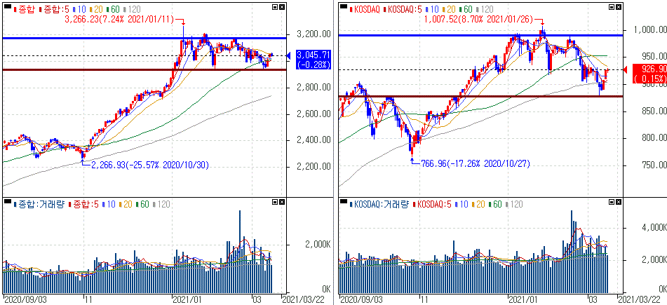금일 코스피 지수는 -0.28% 하락한 3,045.71에 마감하였고, 코스닥 지수는 +0.15% 상승한 926.90에 마감하였습니다.