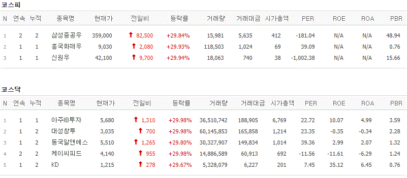 코스피에서는 삼성중공우, 흥국화재우, 신원우가 상한가를 기록했고, 코스닥에서는 아주IB투자, 대성창투, 동국알앤에스, 케이씨피드, KD가 상한가를 기록했습니다.