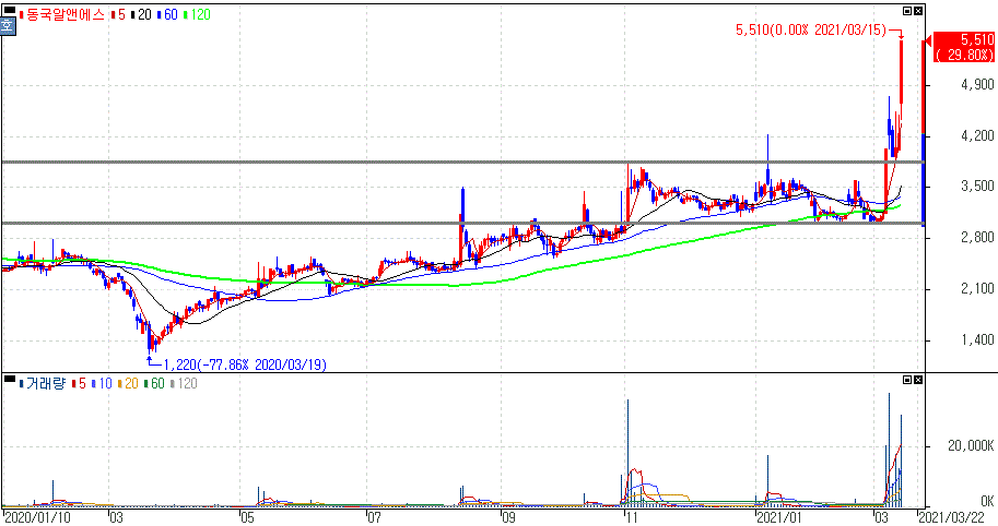 쿼드, 중국산 희토류 견제 등에 희토류 전쟁 본격화 우려 속 상한가를 기록한 동국알앤에스 주가 입니다.