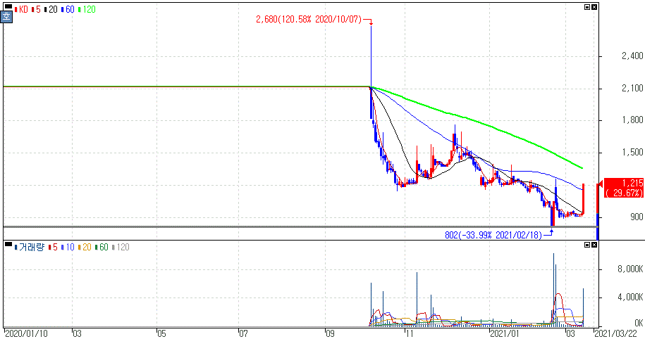 야권에서는 LH 주도의 부동산 정책이 아닌 민간주도 부동산 정책으로 전환하라는 목소리가 나오고 있고, 이재명 지사는 '부동산 백지신탁제'를 도입해야한다고 하면서 LH문제에 대해서 비판했습니다. KD는 최근 이재명 관련주로도 부각이 됐었는데 부동산 관련 밀접한 종목이다보니 영향을 적지 않게 받은 모습입니다.