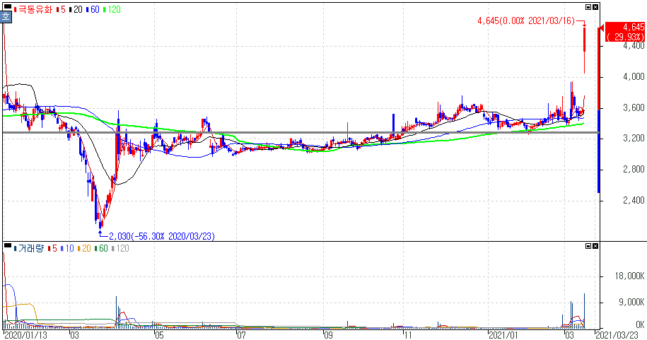 윤석열 최측근 조상준 변호사 사외이사 선임 추진 등에 상한가를 기록한 극동유화 주가 입니다.