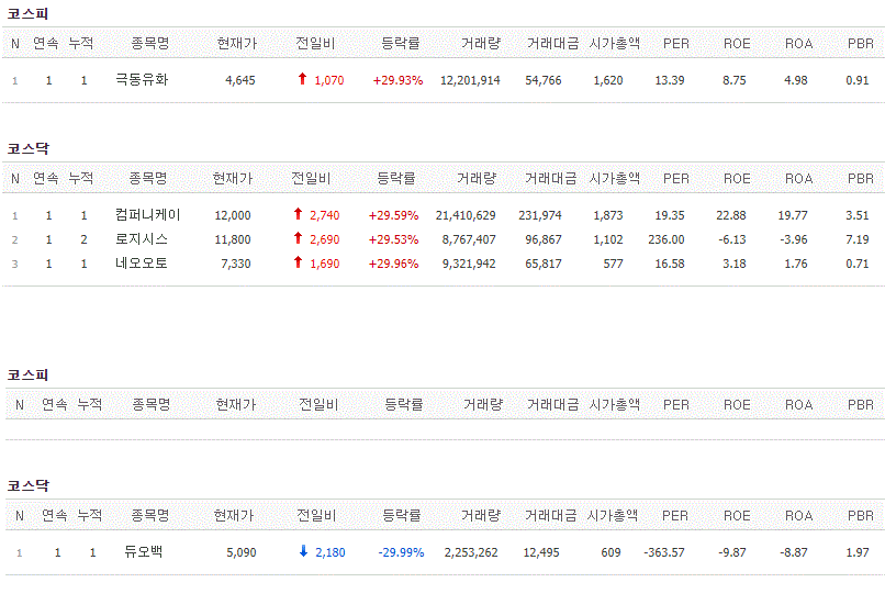 코스피에서는 극동유화가 상한가를 기록했고, 코스닥에서는 컴퍼니케이, 로지시스, 네오오토가 상한가를 기록했습니다. 반면 듀오백이 하한가를 기록했습니다.