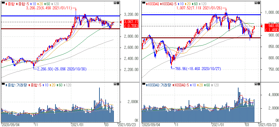 금일 코스피 지수는 +0.70% 상승한 3,067.17에 마감하였고, 코스닥 지수는 +1.48% 상승한 940.65에 마감하였습니다. 미국發 긍정적인 경제지표와 이틀 연속 연기금의 순매수세가 이어지면서 단기적으로 반등기세로 잡힌 모습입니다.