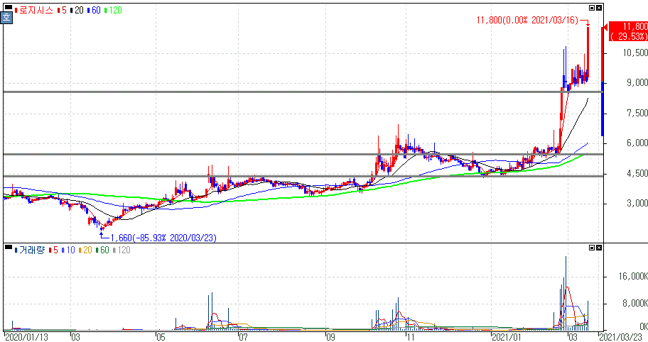 美/中 디지털화폐 경쟁 본격화 소식 등에 상한가를 기록한 로지시스 주가 입니다.