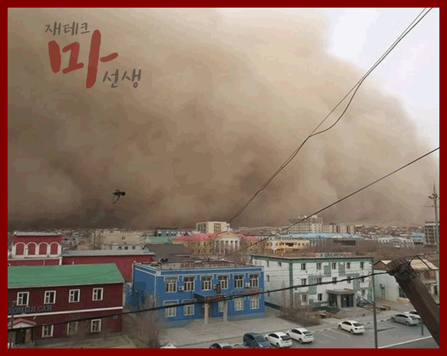몽골 중남부에서 촬영된 자료들에서는 모래폭풍이 마을 덮치는 모습이 담겼습니다. 몽골의 사막지대에서 최고 풍속이 초속 40m에 이르는 황사가 발생하면서 저기압 상승기류를 타고 공중으로 부양해 바람을 타고 한반도까지 날아오게 됩니다.