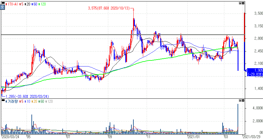 감사보고서 제출 지연에 하한가를 기록한 ITX-AI 주가 입니다.