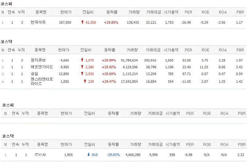 코스피에서는 한국석유가 상한가를 기록했고, 코스닥에서는 원익큐브, 에프앤가이드, 승일, 팬스타엔터프라이즈가 상한가를 기록했습니다. 반면 ITX-AI가 하한가를 기록했습니다.