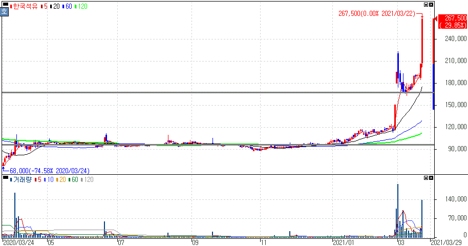 무상증자 모멘텀 지속 등으로 상한가를 기록한 한국석유 주가 입니다.