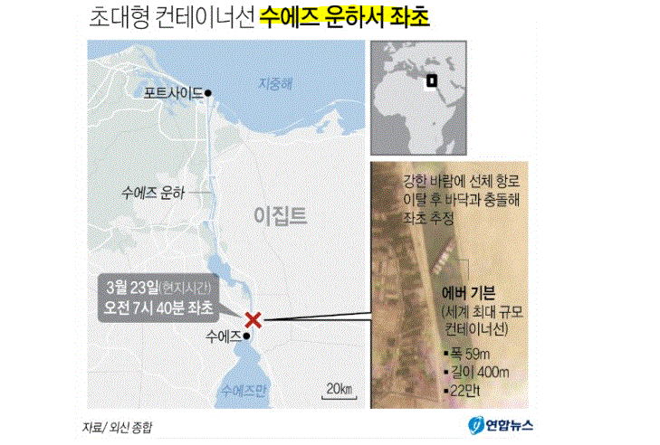 이집트 수에즈 운하에 400m 되는 초대형 컨테이너선 단 한대가 좌초되면서 세계적인 영향을 받고 있습니다.