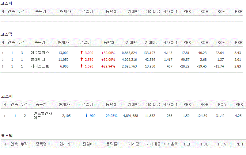 코스피에서는 상한가 종목이 없었고, 코스닥에서는 이수앱지스, 플레이디, 캐리소프트가 상한가를 기록했습니다. 반면 센트럴인사이트가 하한가를 기록했습니다.