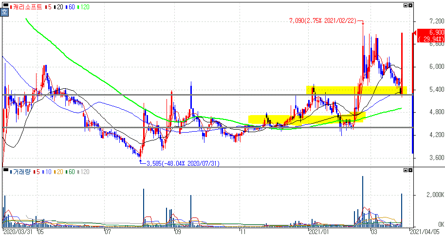 이로 인해 상한가를 기록한 캐리소프트를 투자한 바 있는 DSC인베스트먼트도 장중 급등을 보인 후 +7.21% 상승마감을 하였습니다.