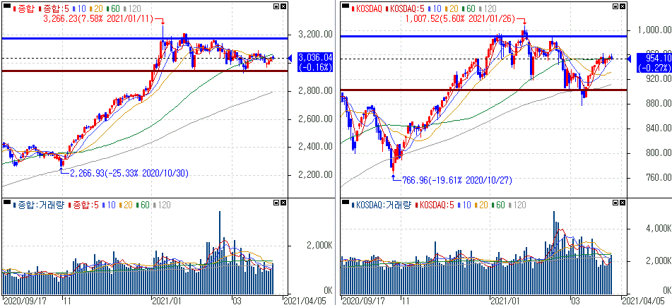 금일 코스피 지수는 -0.16% 하락한 3,036.04에 마감하였고, 코스닥 지수는 -0.27% 하락한 954.10에 마감하였습니다.