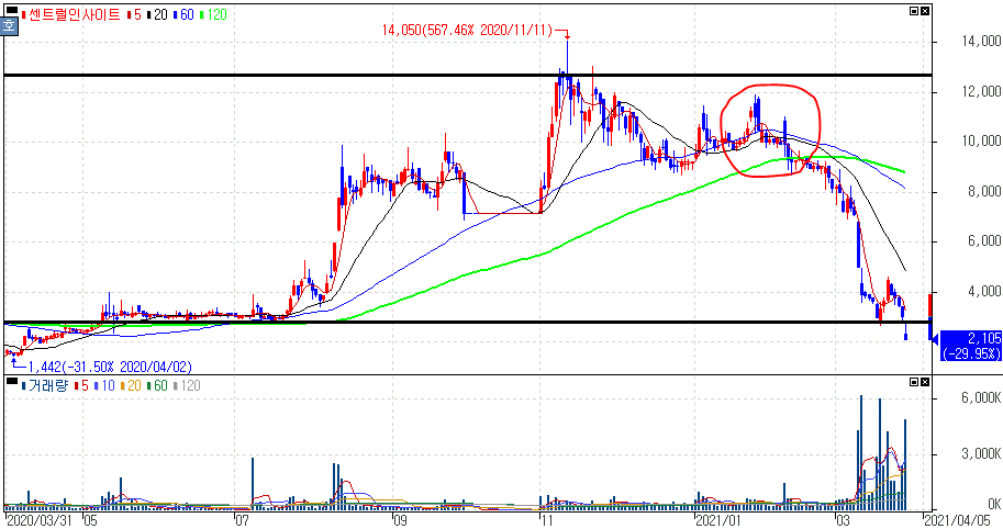 사업보고서 미제출로 하한가를 기록한 센트럴인사이트 주가 입니다.