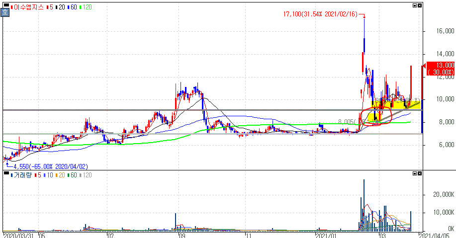 코로나19 러시아 백신 시생산 위한 기술이전 개시 소식에 상한가를 기록한 이수앱지스 주가 입니다.