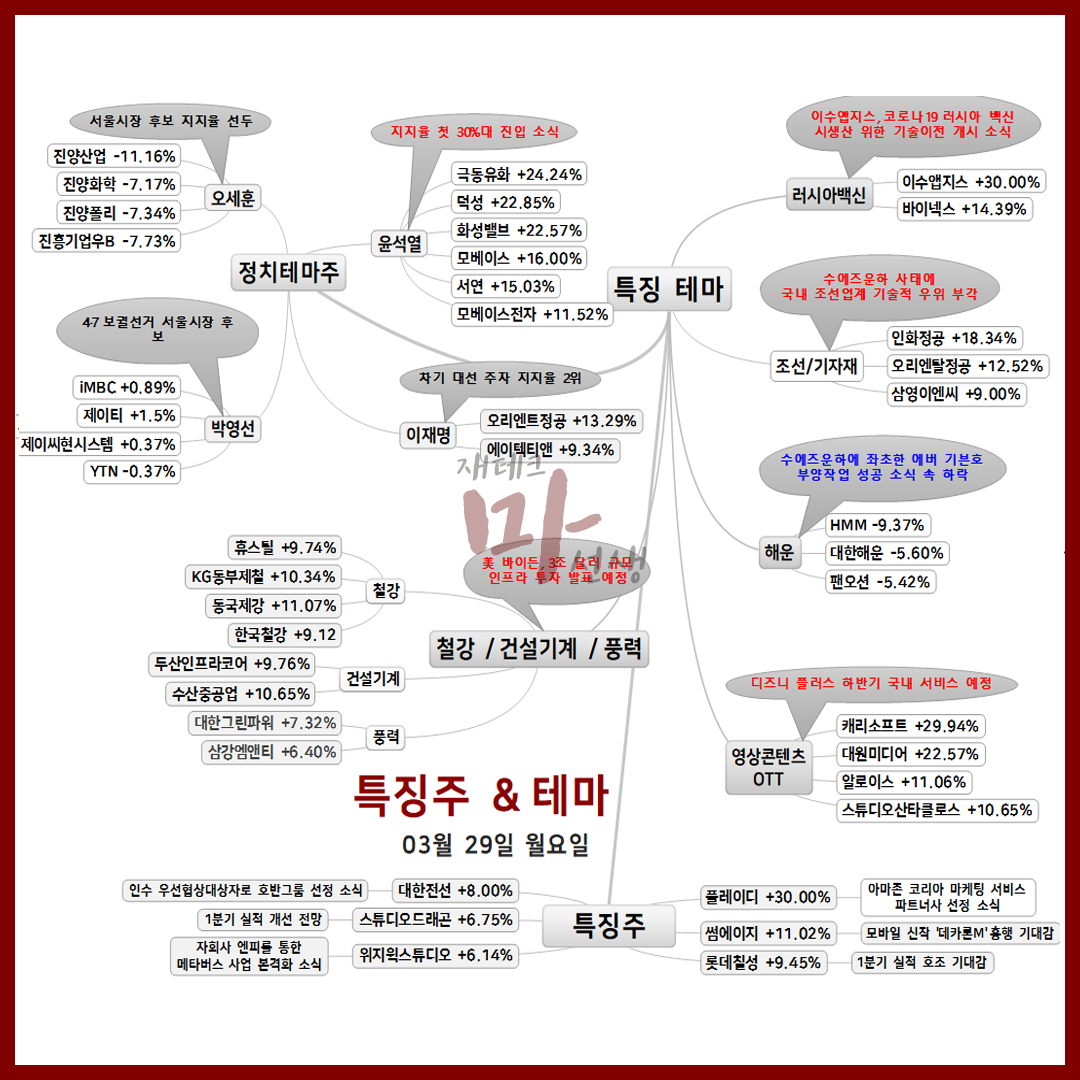3월 29일 주요 특징주 및 특징테마