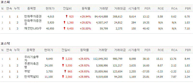 코스피에서는 한화투자증권, 한화투자증권우, 깨끗한나라우가 상한가를 기록했고, 코스닥에서는 우리기술투자, 푸른저축은행, 부방, 한국맥널티가 상한가를 기록했습니다.