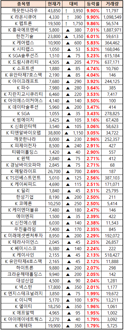 시간외 단일가매매 종가 종목 확인시 단순 급등주 등락률만 볼 것이 아니라, '거래량'에 따르는 거래대금도 판단하면서 보는 것이 중요합니다.