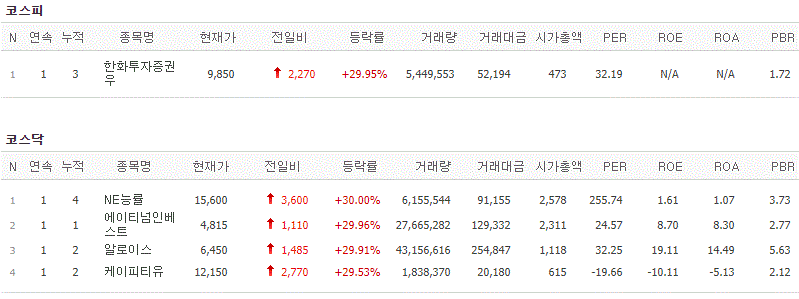 코스피에서는 한화투자증권우가 상한가를 기록했고, 코스닥에서는 NE능률, 에이티넘인베스트, 알로이스, 케이피티유가 상한가를 기록했습니다.