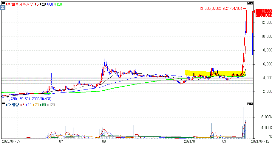 두나무 美 상장 기대감 및 비트코인 연일 강세 지속 등에 상한가를 기록한 한화투자증권우 주가 입니다.