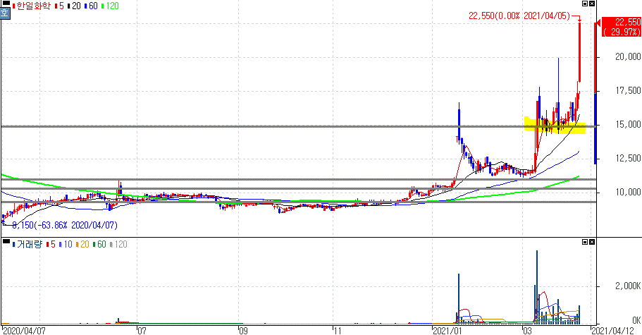 서울시장 보궐선거 D-2 오세훈 관련주로 부각되면서 상한가를 기록한 한일화학 주가 입니다.