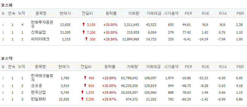 코스피에서는 한화투자증권우, 신화실업, 씨아이테크가 상한가를 기록했고, 코스닥에서는 한국테크놀로지, 손오공, 현우산업, 한일화학이 상한가를 기록했습니다.