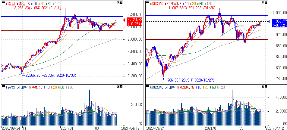 금일 코스피 지수는 +0.26% 상승한 3,120.83에 마감하였고, 코스닥 지수는 -0.03% 하락한 969.77에 마감하였습니다.