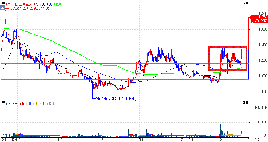 문강배 변호사 ESG 위원장 선임 속 윤석열 관련주 지속 부각되면서 상한가를 기록한 한국테크놀로지 주가 입니다.