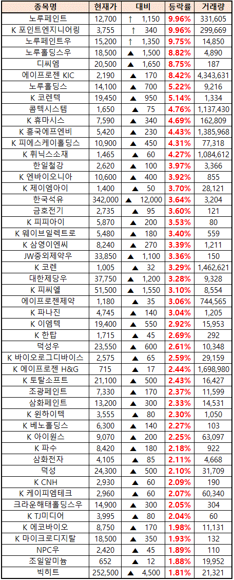 시간외 단일가매매 종가 종목 확인시 단순 급등주 등락률만 볼 것이 아니라, '거래량'에 따르는 거래대금도 판단하면서 보는 것이 중요합니다.
