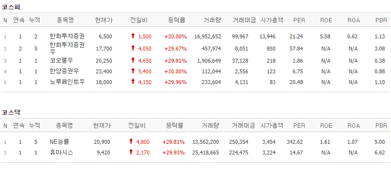 코스피에서는 한화투자증권, 한화투자증권우, 코오롱우, 한양증권우, 노루페인트우가 상한가를 기록했고, 코스닥에서는 NE능률, 휴마시스가 상한가를 기록했습니다.
