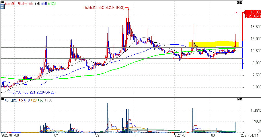 윤석열 테마주로 편입되면서 상한가를 기록한 크라운제과, 크라운제과우 주가 입니다.