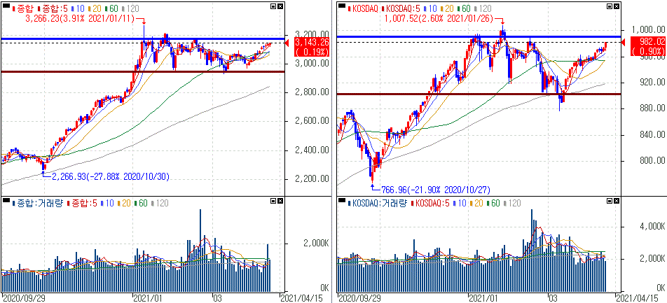 금일 코스피 지수는 +0.27% 상승한 3,145.81에 마감하였고, 코스닥 지수는 +0.89% 상승한 891.90에 마감하였습니다. 전 고점 구간에 다가가고 있는 상황입니다.