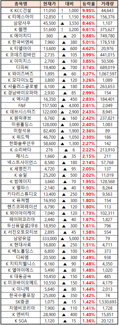 2021년 04월 09일 시간외 상한가 상승종목 및 이유 :: KCC건설 티에스아이 웹젠 와이즈버즈 주가 외 특징주