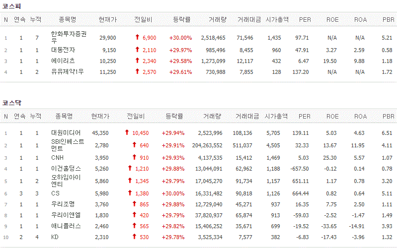 코스피에서는 한화투자증권우, 대동전자, 에이리츠, 유유제약1우가 상한가를 기록했고, 코스닥에서는 대원미디어, SBI인베스트먼트, CNH, 이건홀딩스, 오하임아이엔티, CS, 우리조명, 우리이앤엘, 애니플러스, KD가 상한가를 기록했습니다.