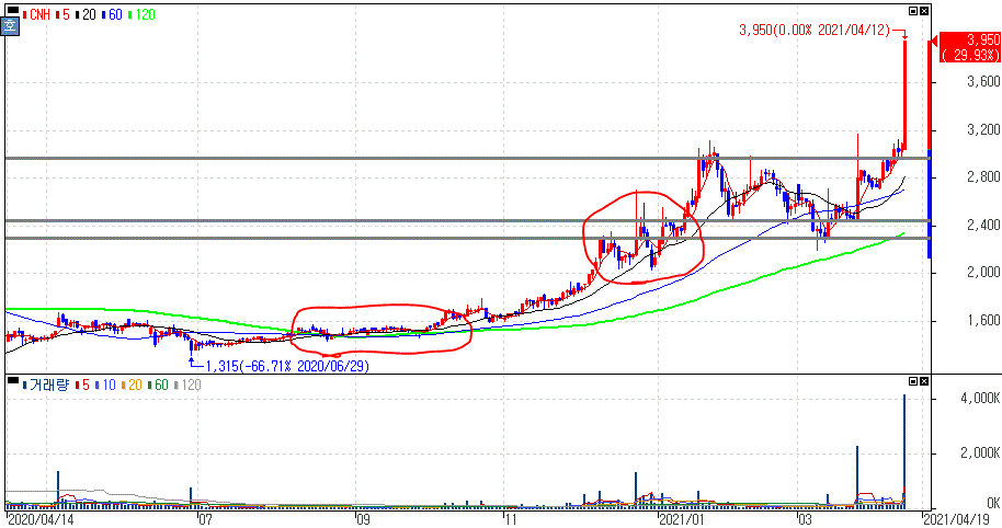 여신전문금융업체 상한가를 기록한 CNH 주가 입니다.