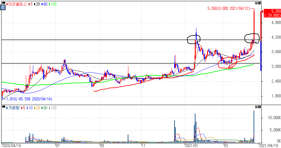 건설 경기 활성화 기대감 지속에 상한가를 기록한 이건홀딩스 주가 입니다.