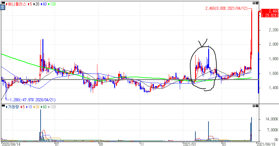 윤석열 관련주 편입 및 우마무스메(말딸), 귀멸의칼날 관련주 등 모멘텀 속 상한가를 기록한 애니플러스 주가 입니다.