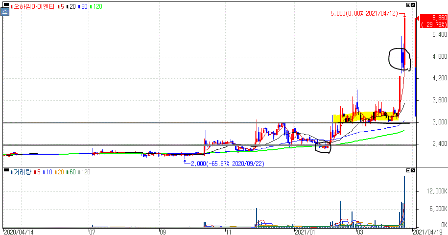 최대주주 IMM인베스트가 크래프톤 투자사로 부각되면서 상한가를 기록한 오하임아이엔티 주가 입니다.