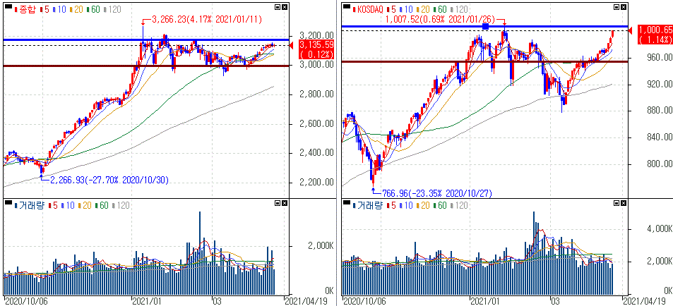 금일 코스피 지수는 +0.12% 상승한 3,135.59에 마감하였고, 코스닥 지수는 +1.14% 상승한 1,000.65에 마감하였습니다. 미국發 Fed 완화적 기조 재확인과 경기 부양 기대감이 더해져 코스닥 1,000선 돌파하는 모습을 보여주었습니다.