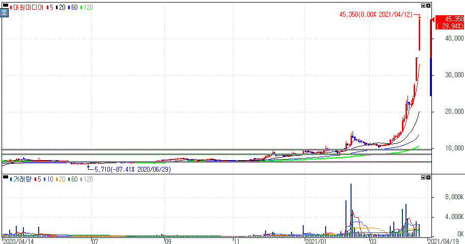 투자경고종목 지정 후 거래재개 속 자회사의 日·中 웹툰 사업 확장 및 용갑합체 아머드 사우루스 흥행 기대감 지속되면서 상한가를 기록한 대원미디어 주가 입니다.
