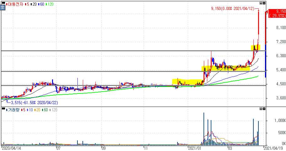 정세균 총리 학연으로 정세균 테마주로 부각을 받아 상한가를 기록한 대동전자 주가 입니다.